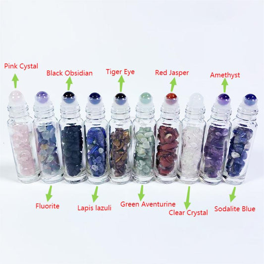 1Pcs 10ml Refillable Glass Gemstone Roller Ball Bottles with Bamboo Lids Healing Crystal Chips Inside Doterra Essential Oil Vial