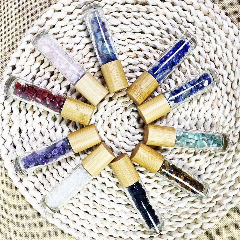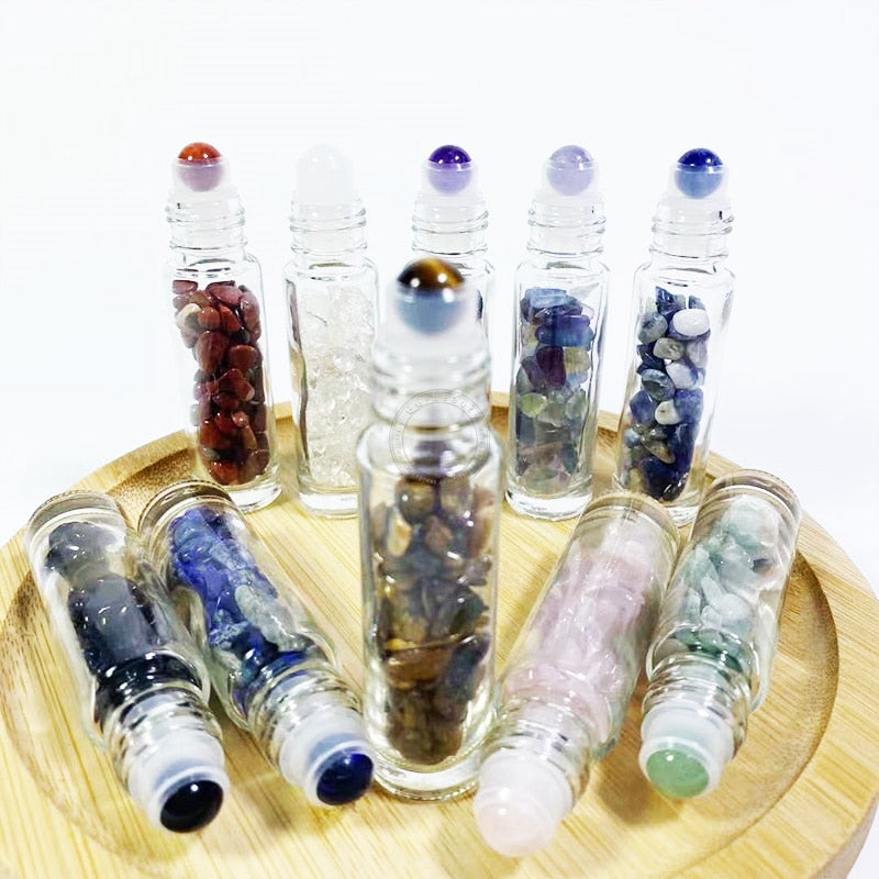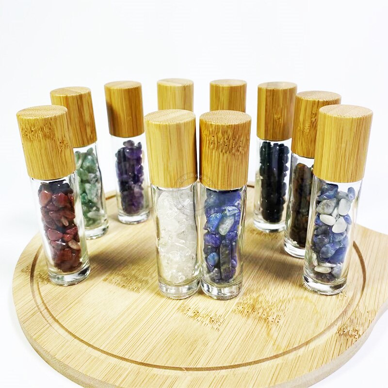 1Pcs 10ml Refillable Glass Gemstone Roller Ball Bottles with Bamboo Lids Healing Crystal Chips Inside Doterra Essential Oil Vial