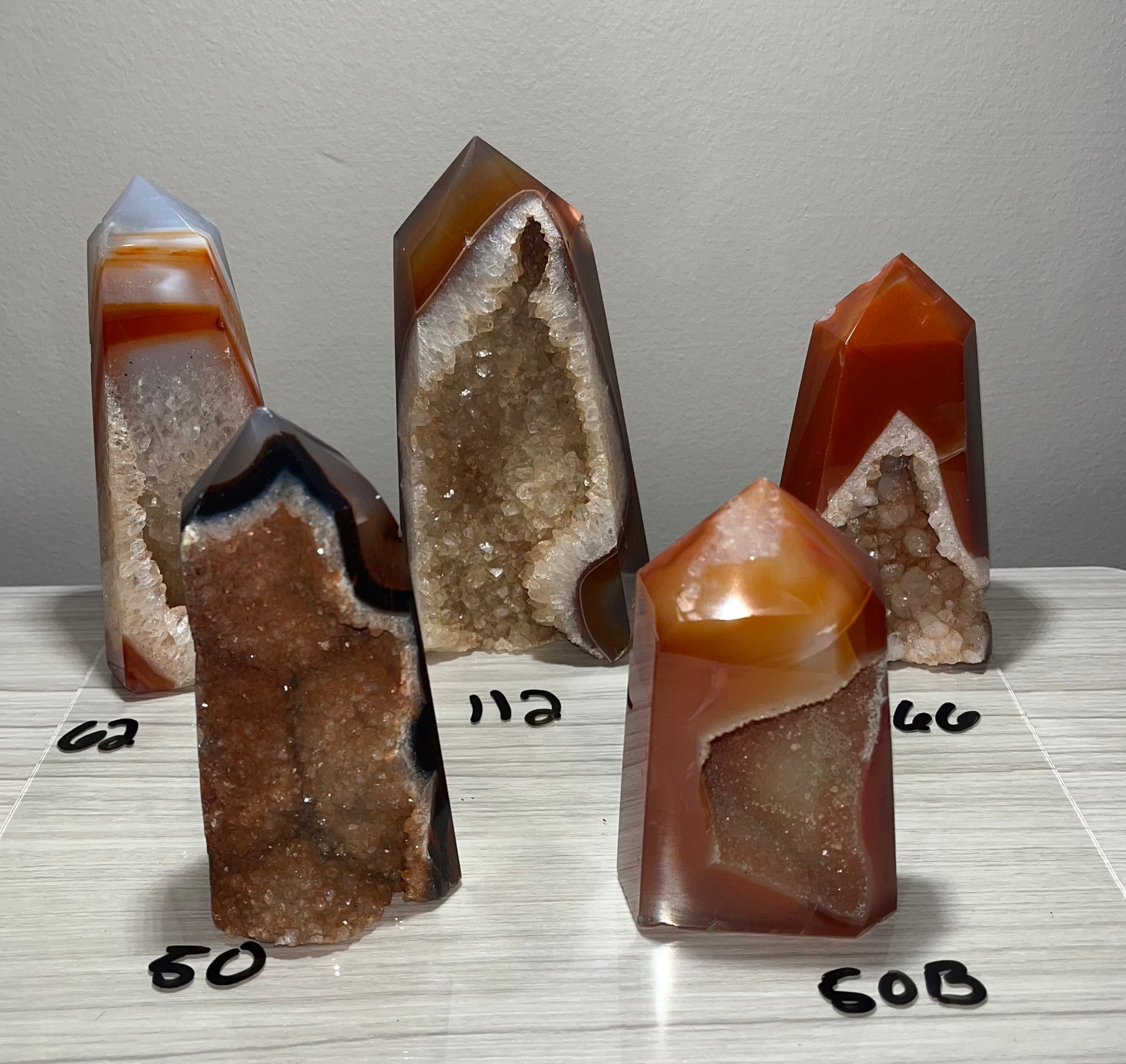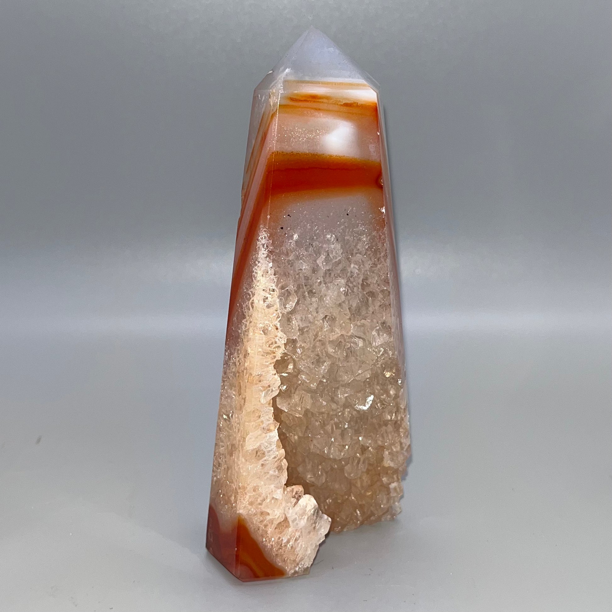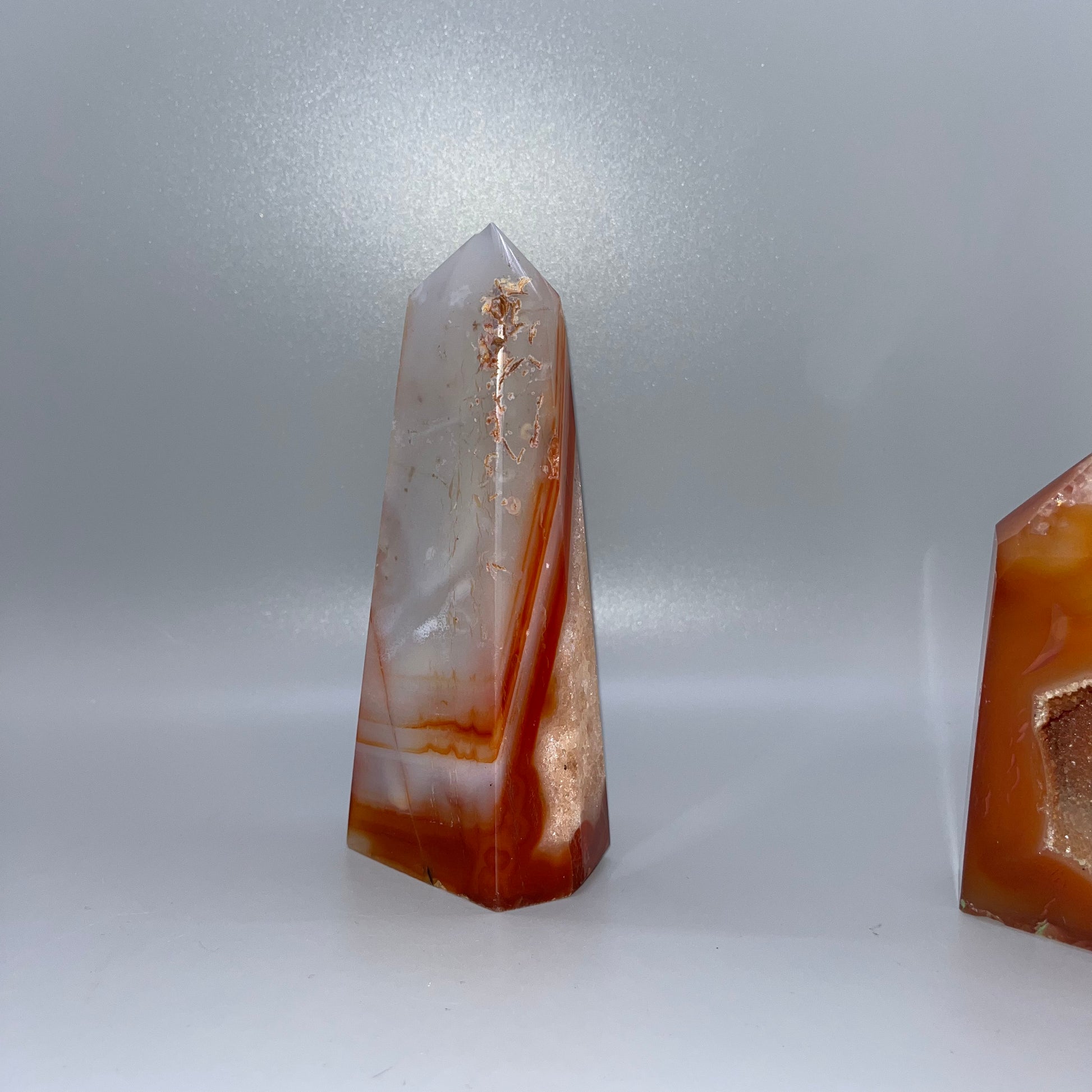 These Carnelian Druzy Towers are the perfect addition to any home. The naturally occurring druzy crystal clusters offer an elegant and sophisticated look, with beautiful shades of orange and red that will make a statement in any room. The carnelian druzy towers are also easy to care for and maintain.