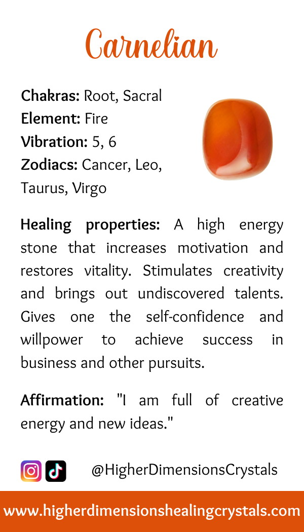 Carnelian is a high energy stone that can help to inspire creativity and help the user to find undiscovered talents! It can also help to improve confidence and increase successfulness.