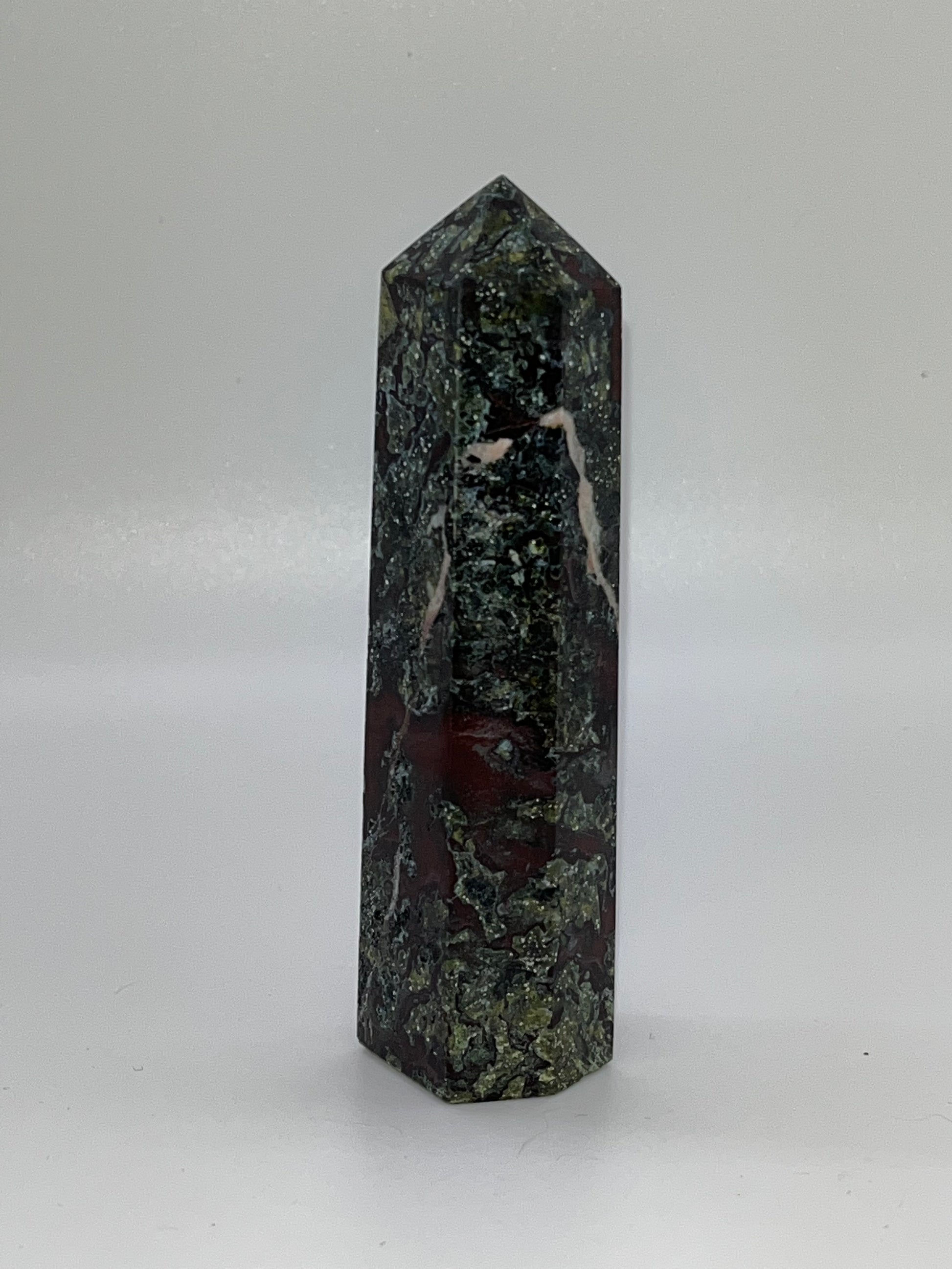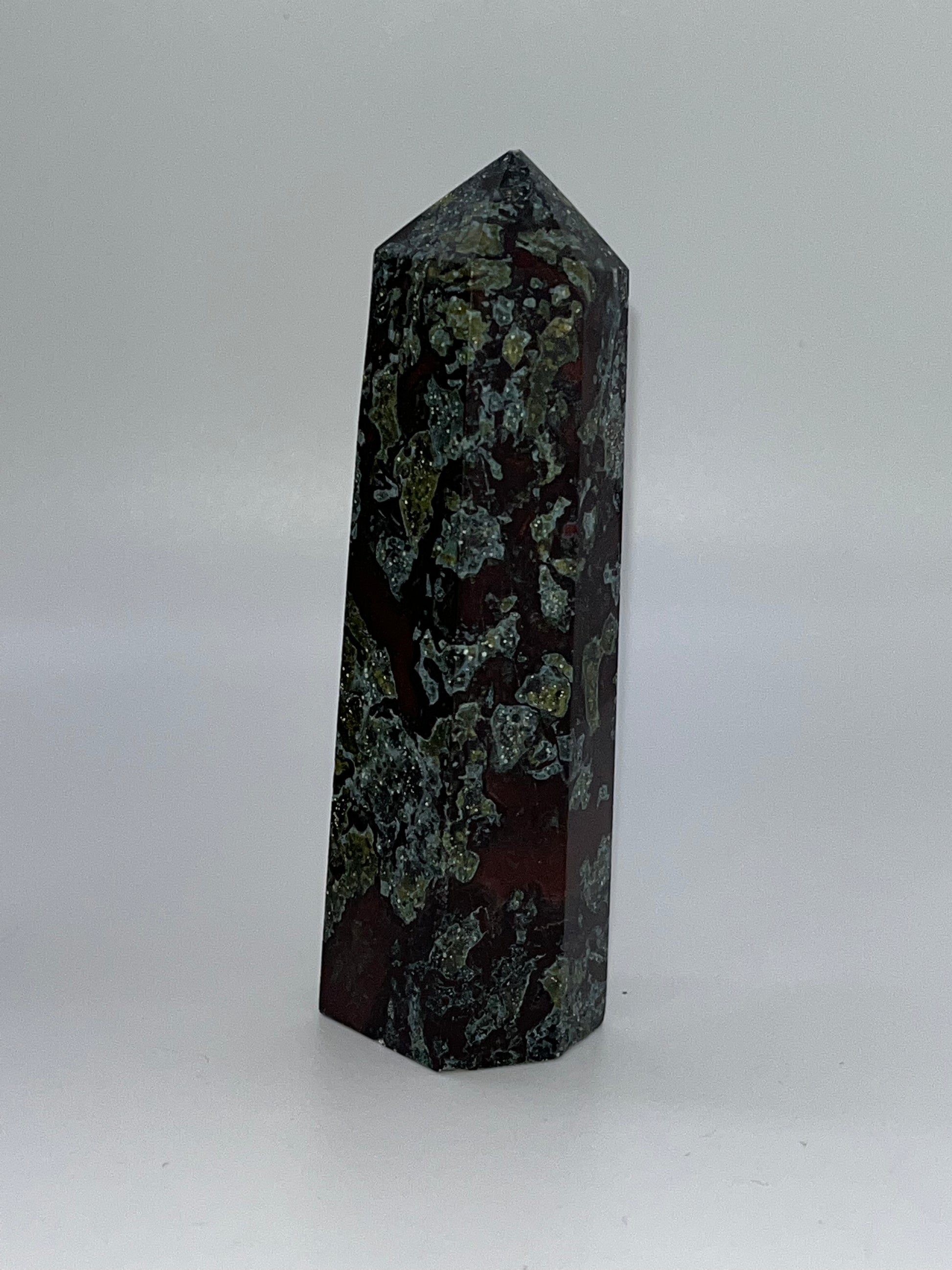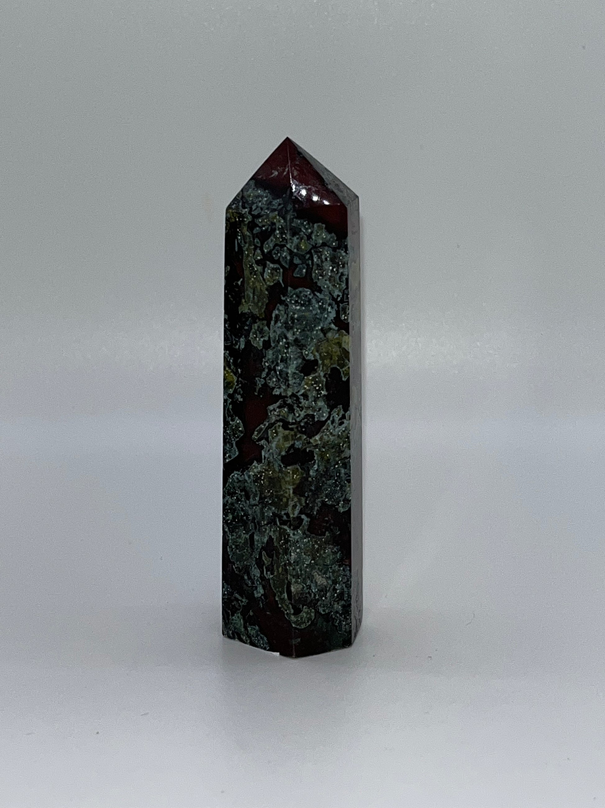 Harness the ancient mystery and power of dragon's blood jasper with this crystal tower. Its deep red hues and unique patterning add beauty and mysticism to your home. Let its energy bring you strength and courage.