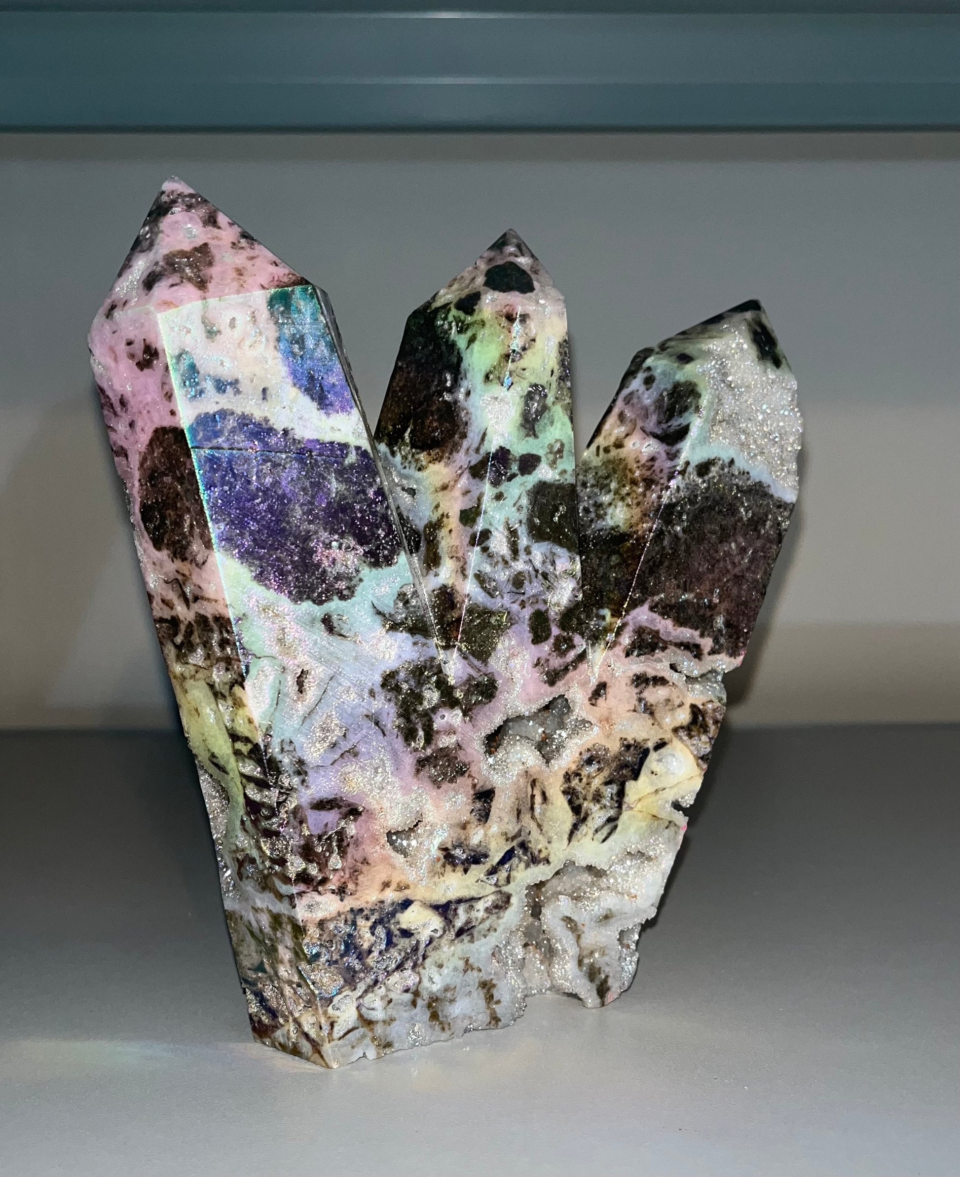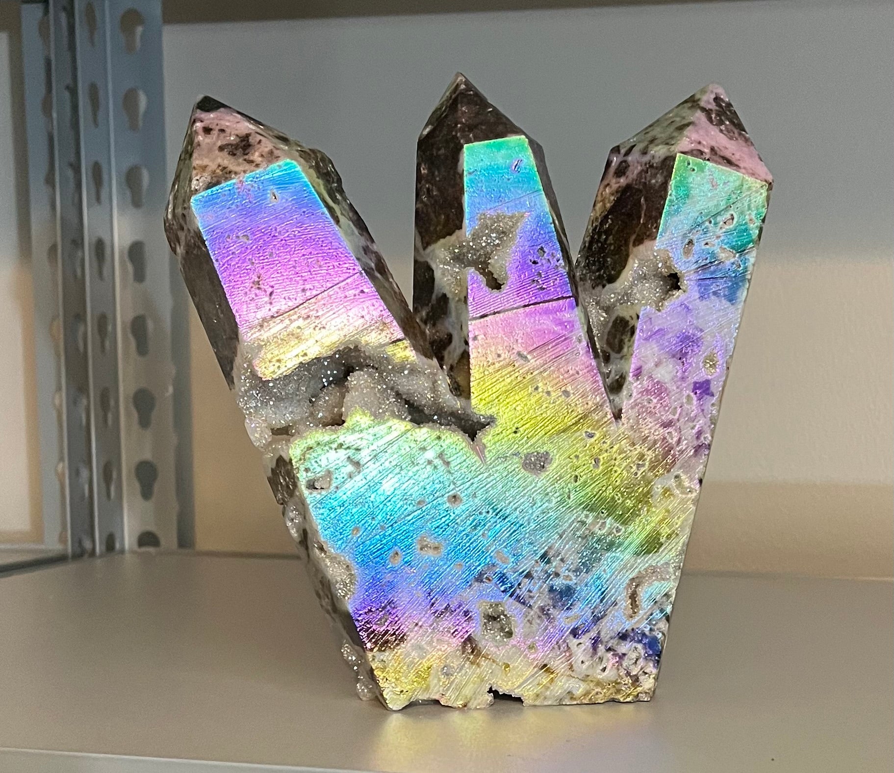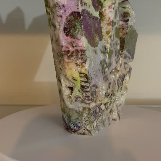 Sphalerite Healing properties: A stone of personal power and energy that deeply stimulates the lower chakras. Promotes self-confidence, stabilizes mood swings, and encourages one to form positive habits and routines. Known as a stone of discernment as it guides one in making the right decisions in life. The aura coating amplifies the energies of the piece!