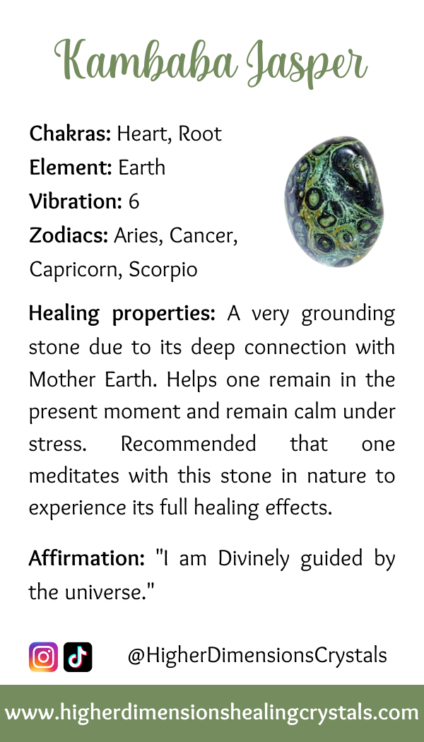 Kambaba Jasper Healing properties: A very grounding stone due to its deep connection with Mother Earth. Helps one remain in the present moment and remain calm under stress. Recommended that one meditates with this stone in nature to experience its full healing effects.