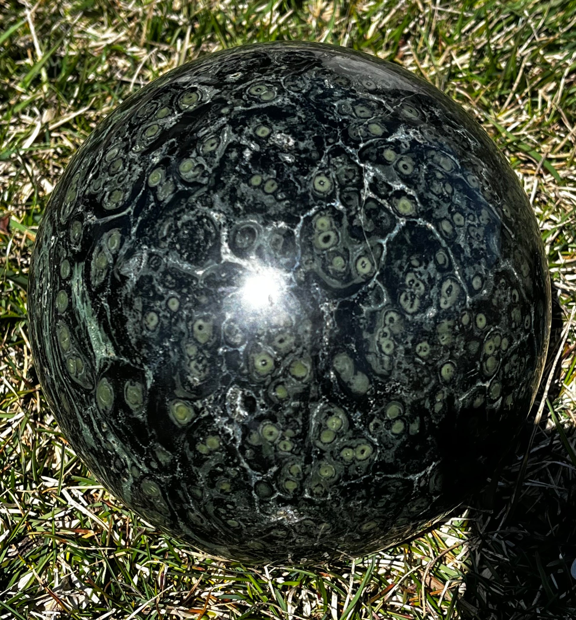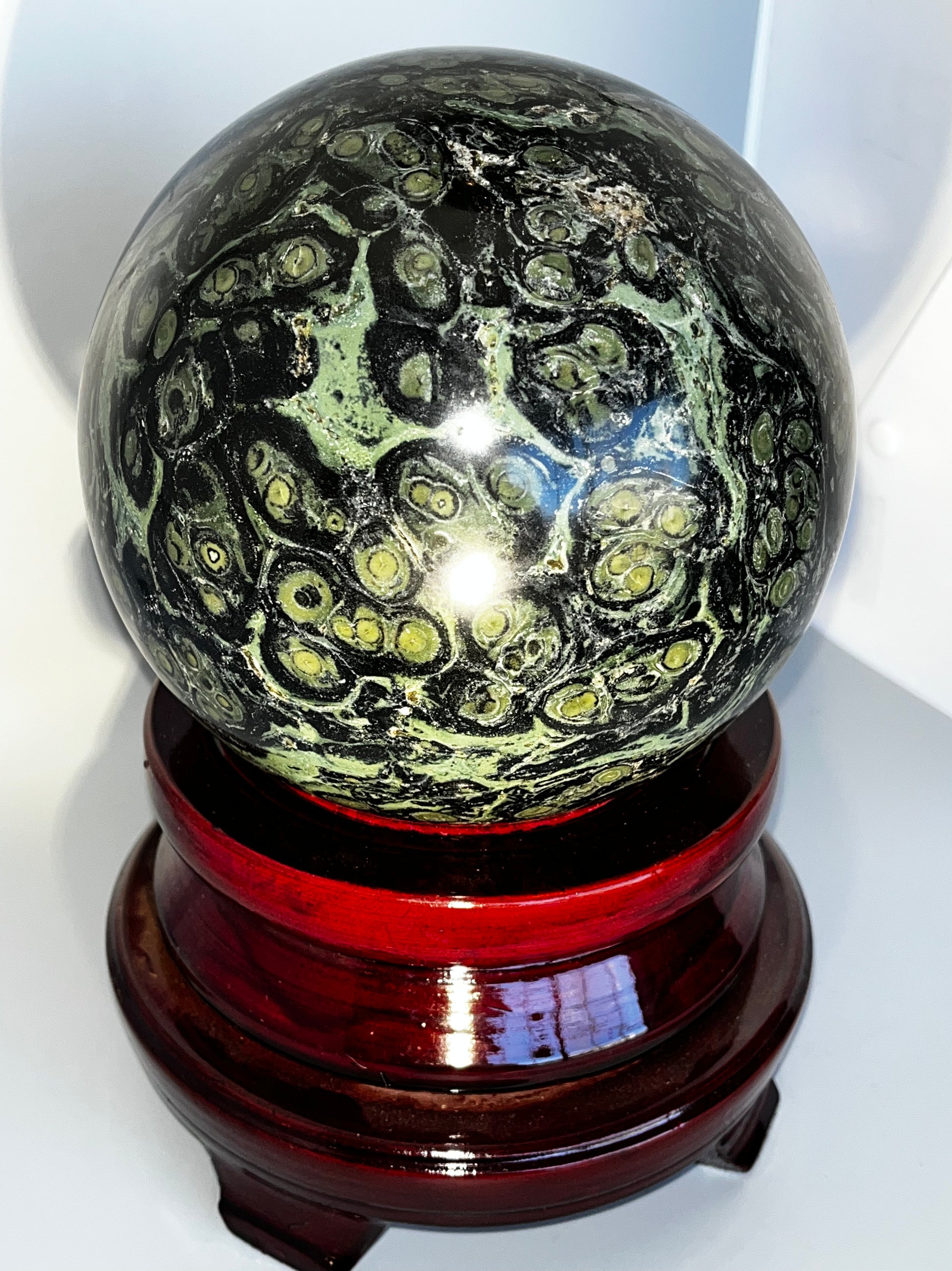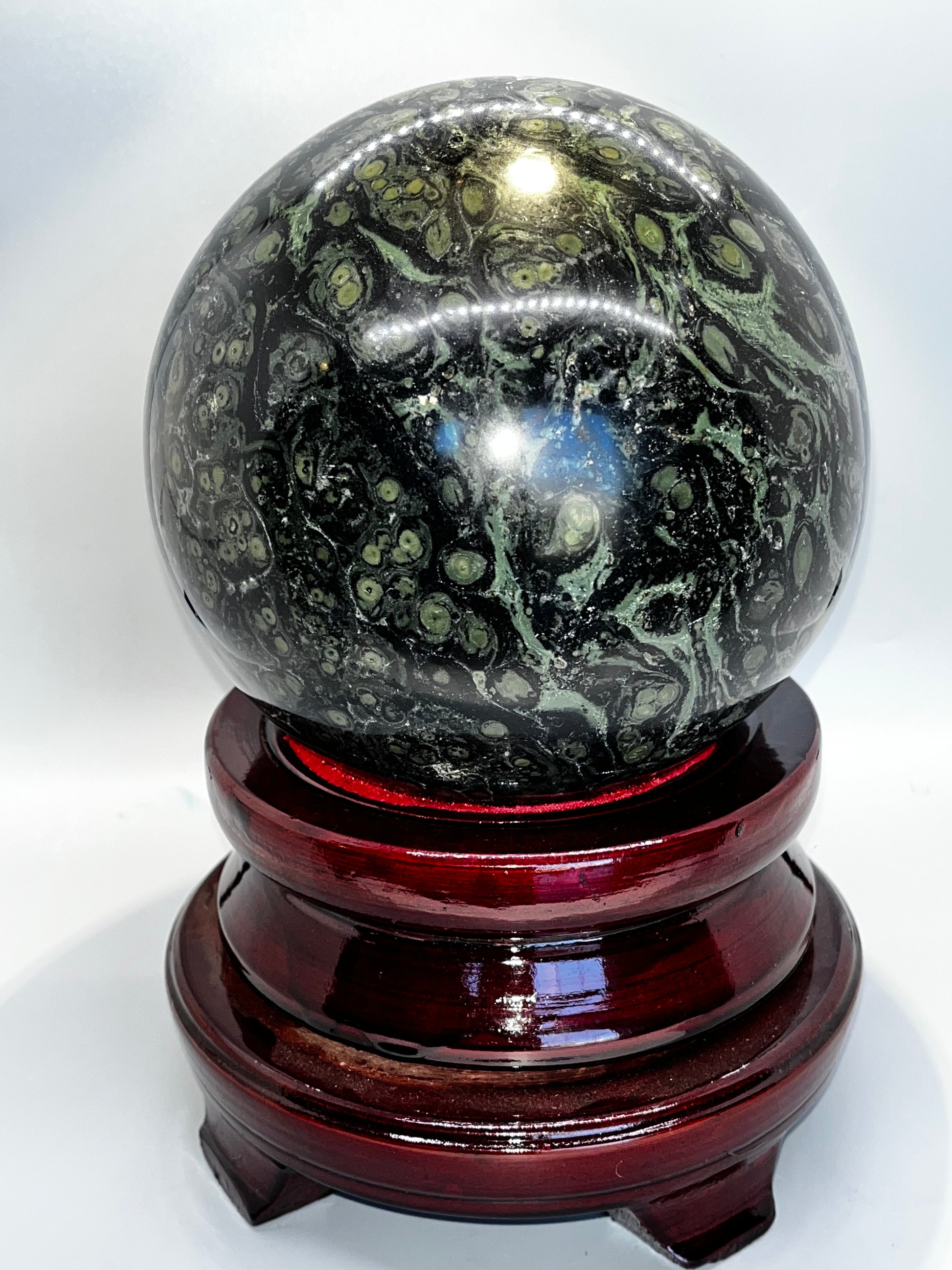 This sphere is absolutely huge! When I saw it, I knew that it had to be in my shop. The Kambaba gives off an energy that feels like a warm hug and offers grounding, nurturing, and protection. Wooden rotating stand included!!!!!!