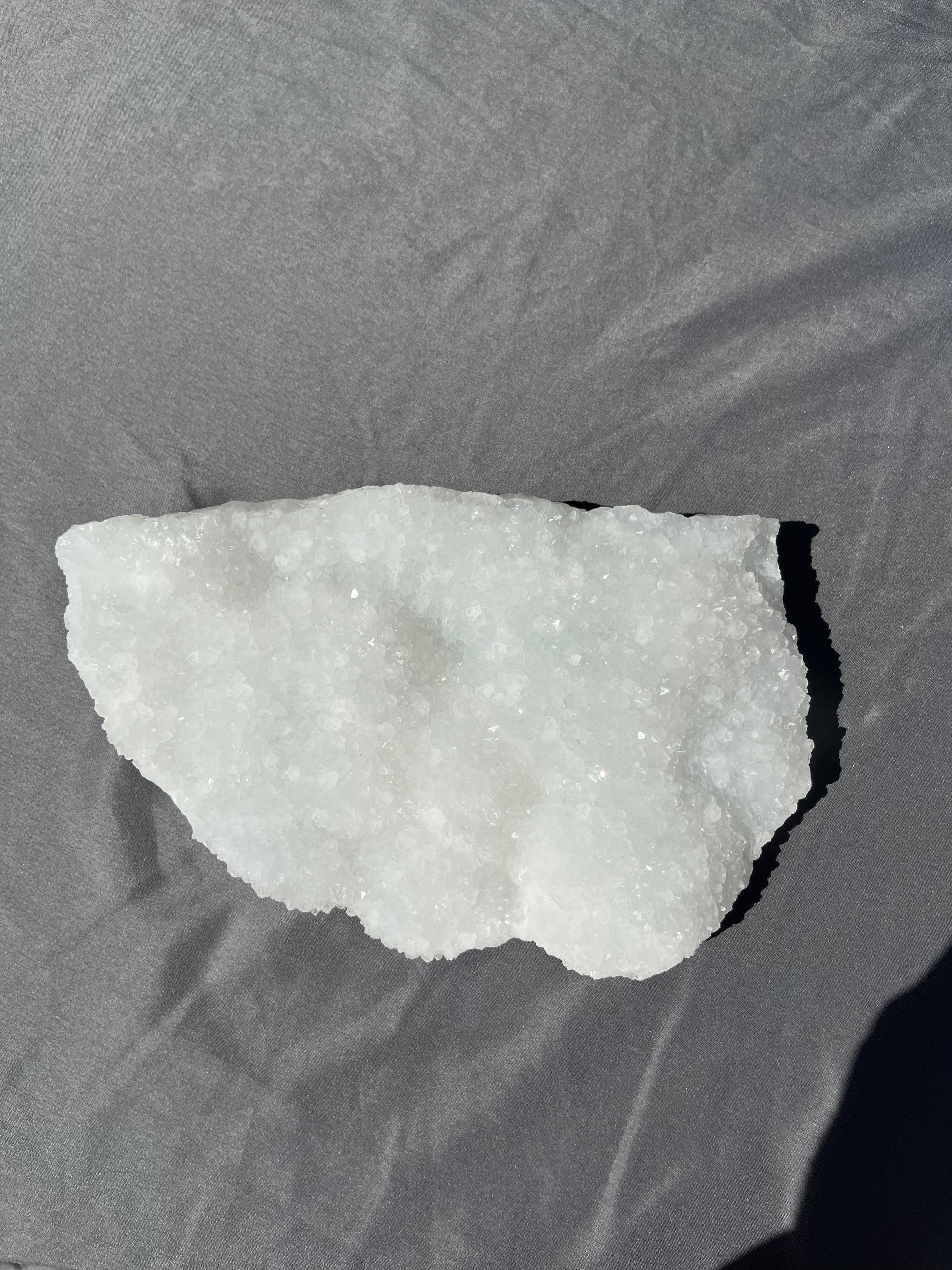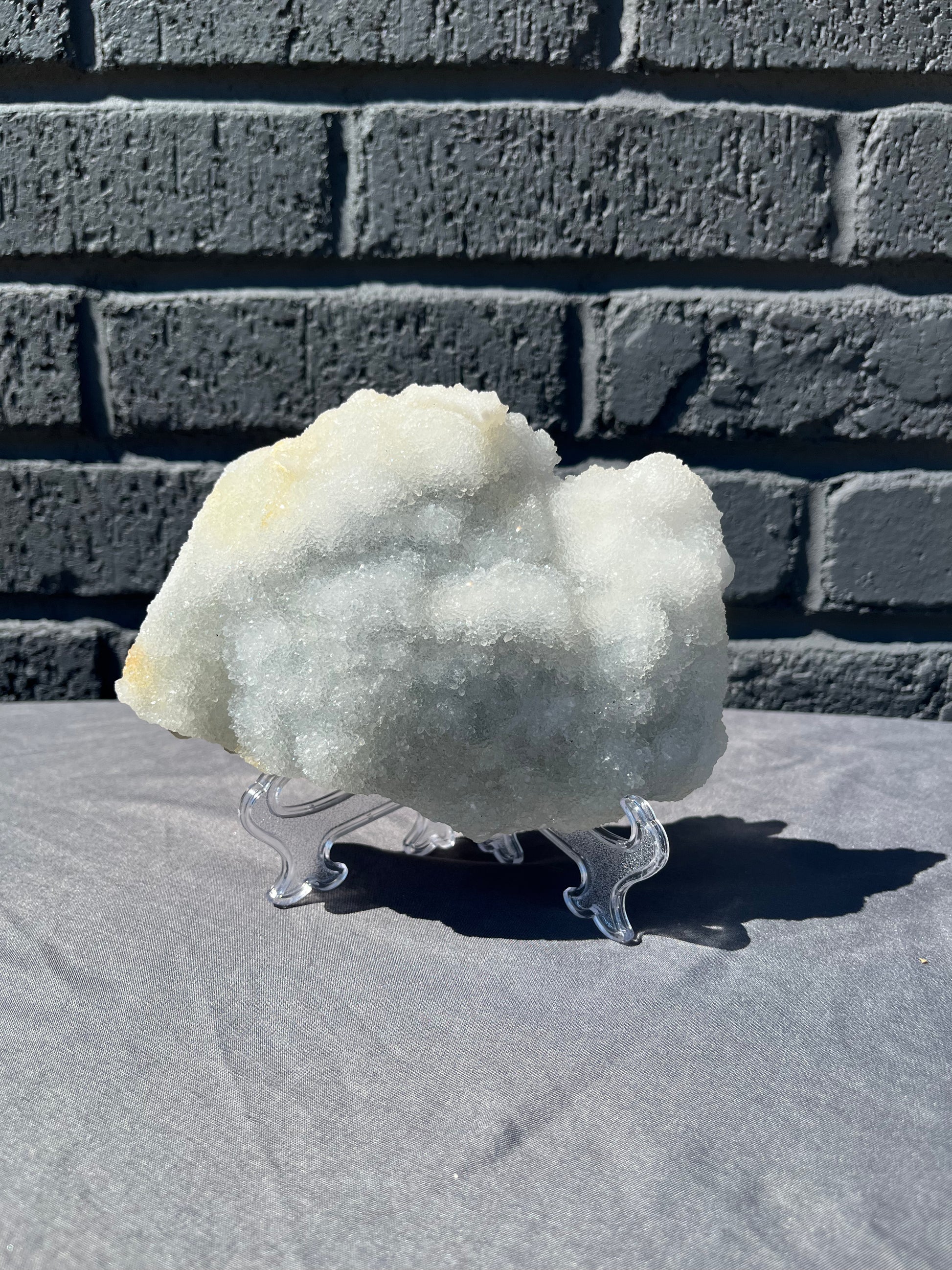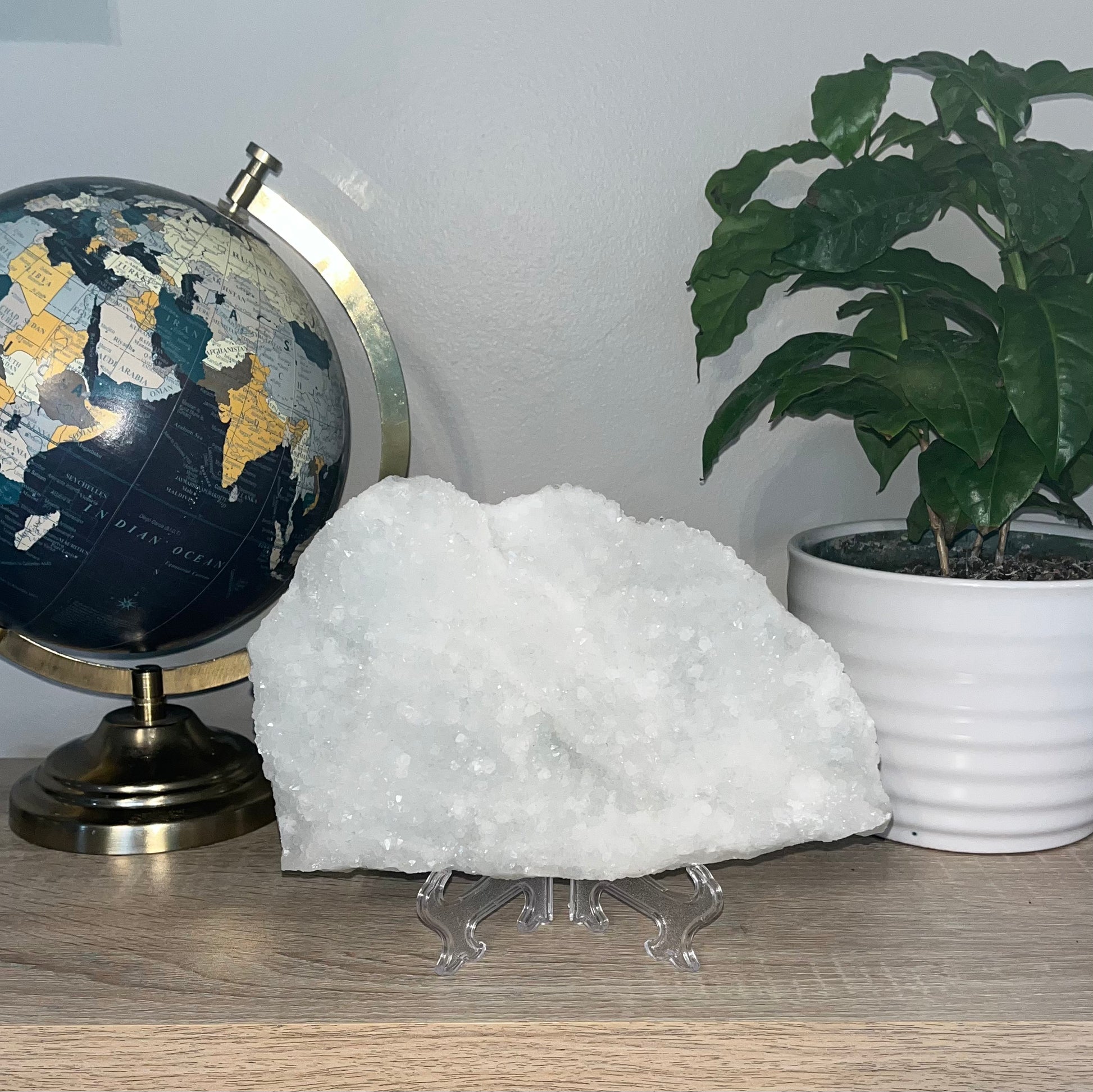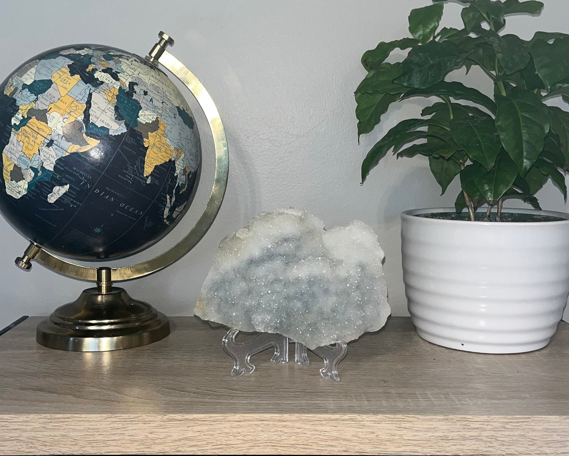 This piece really shines! It is also a 2 for one! Not only does it have the stunning druzy quartz on one side, it also has a thick slab of bright green fluorite on the other side. The quartz helps to magnify the effects of the green fluorite!
