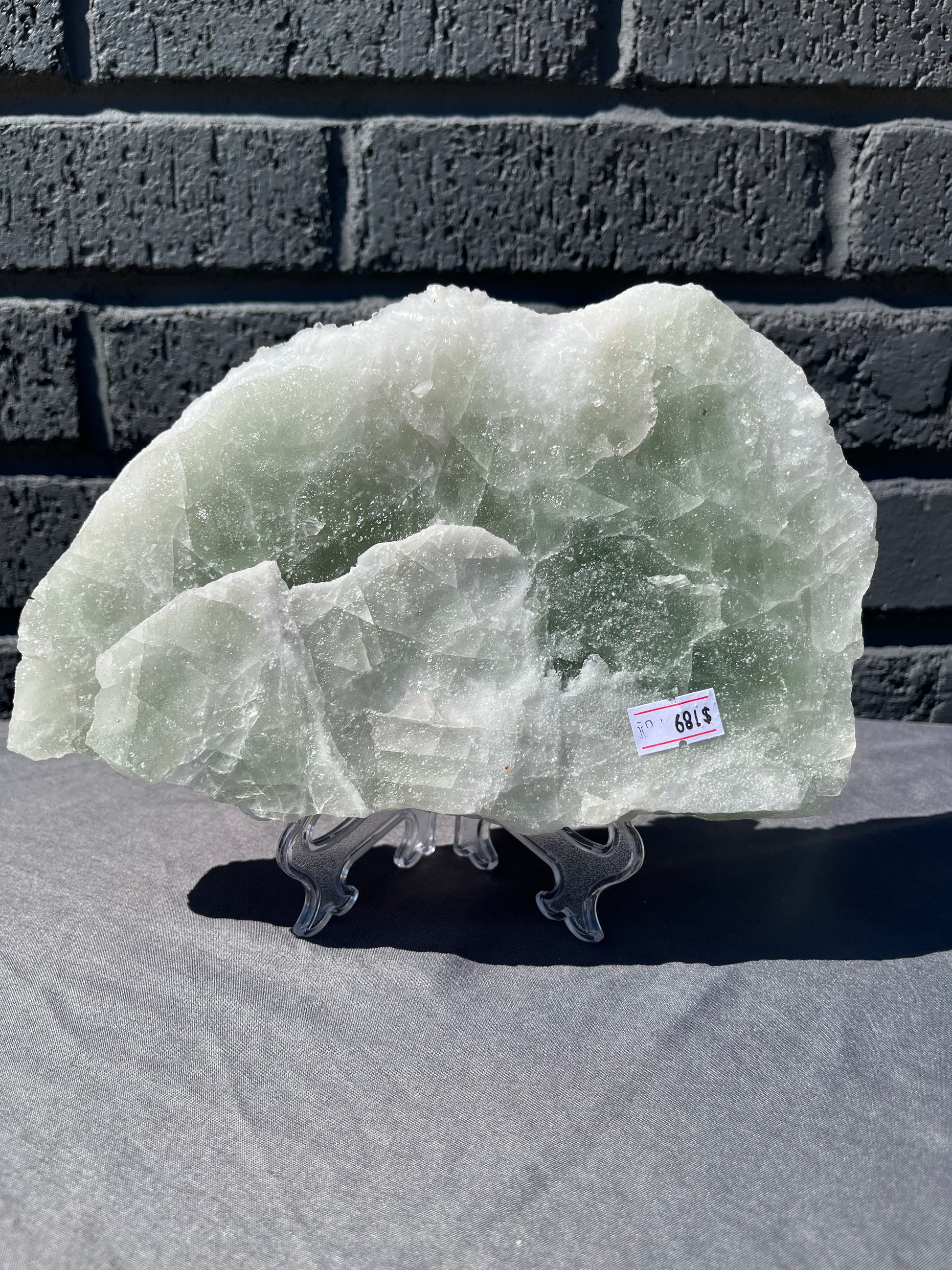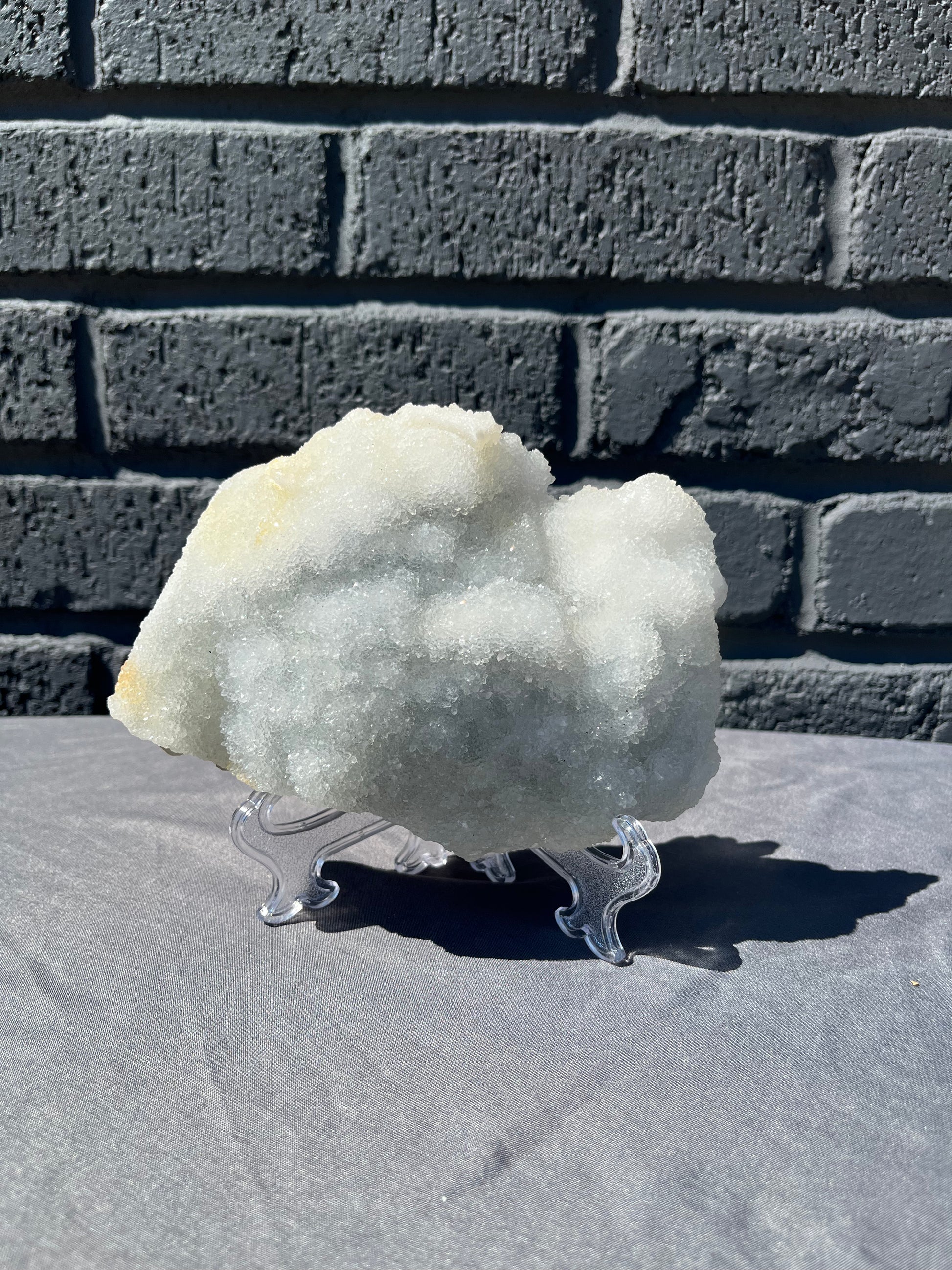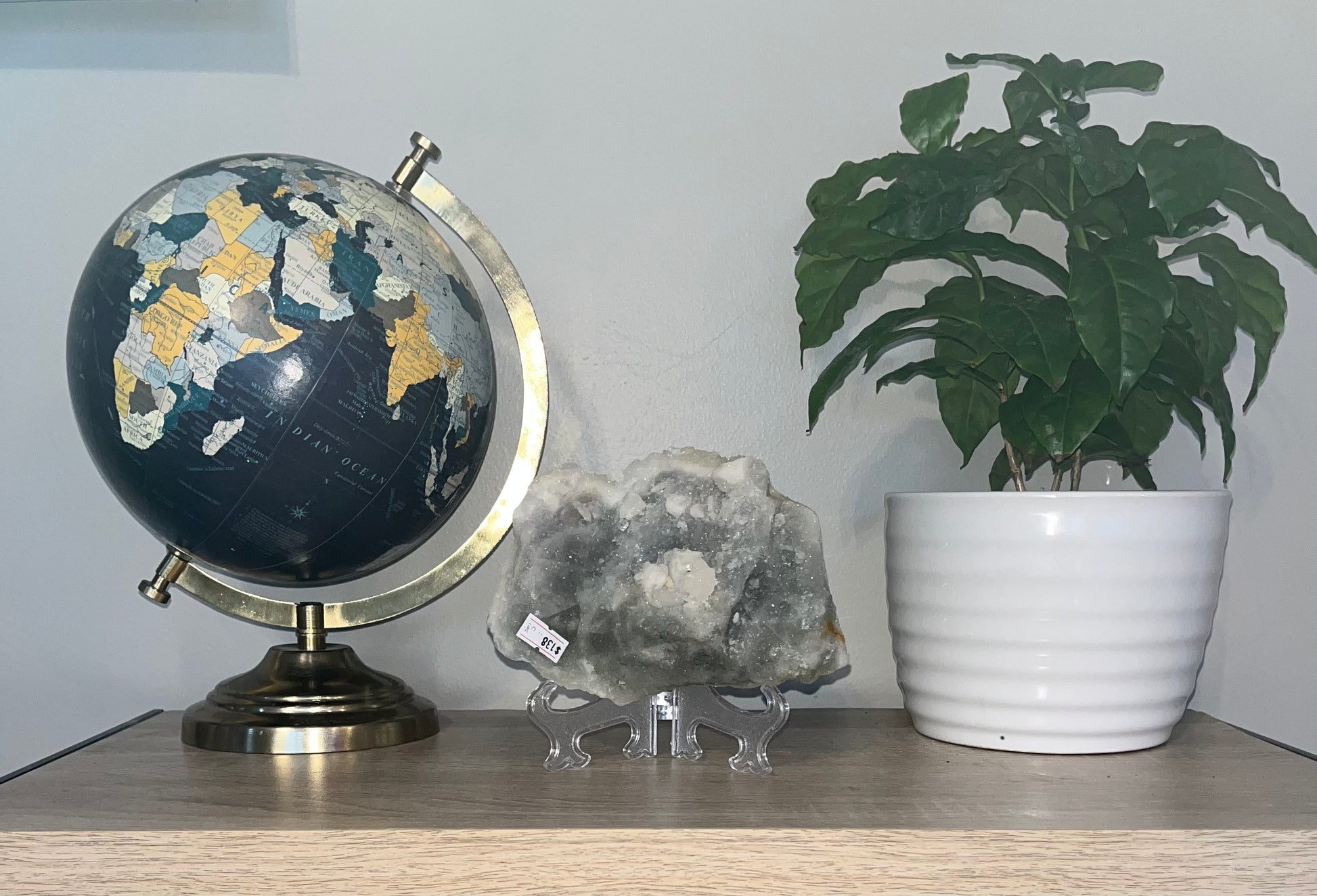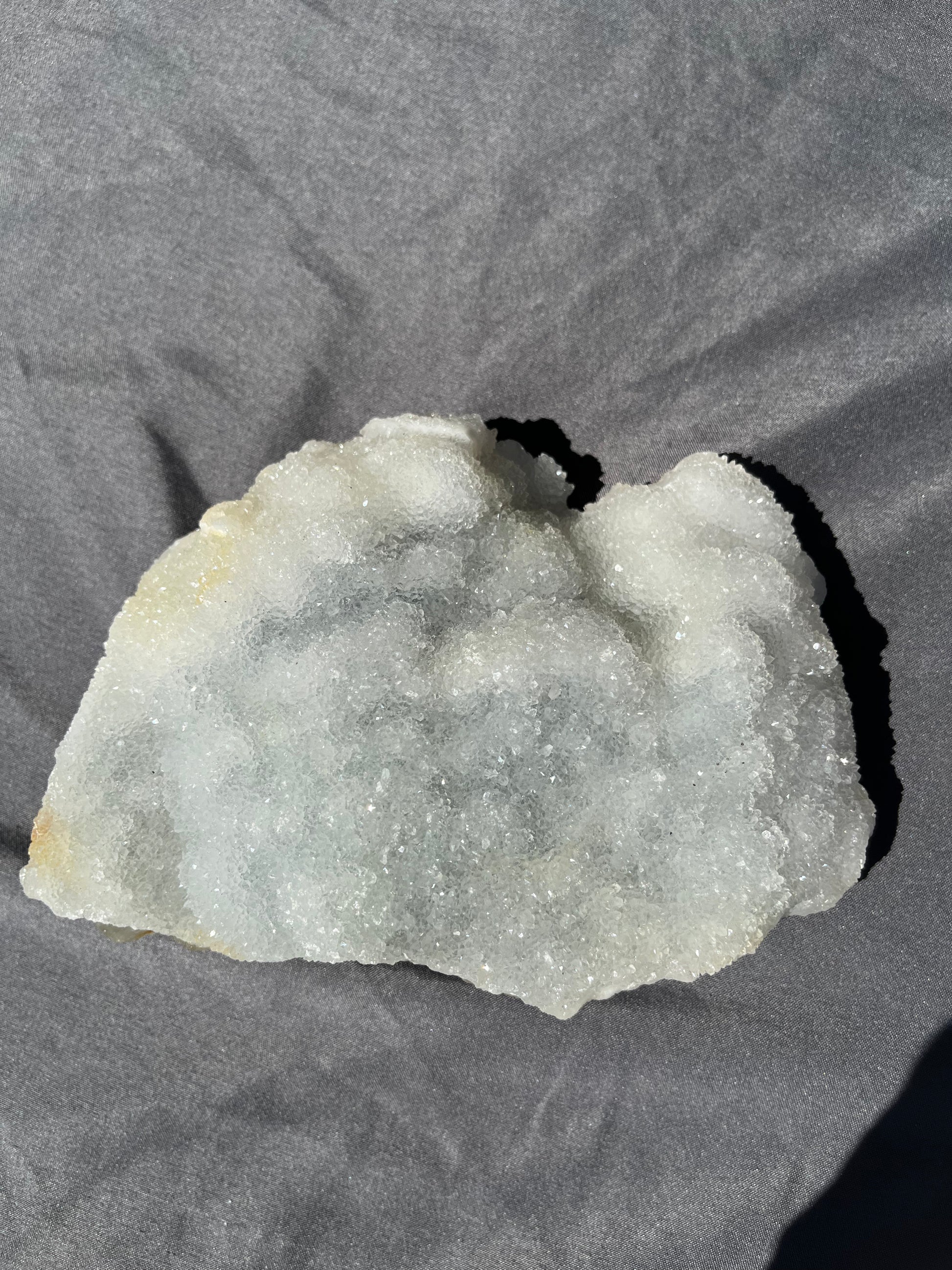 This piece really shines! It is also a 2 for one! Not only does it have the stunning druzy quartz on one side, it also has a thick slab of bright green fluorite on the other side. The quartz helps to magnify the effects of the green fluorite!