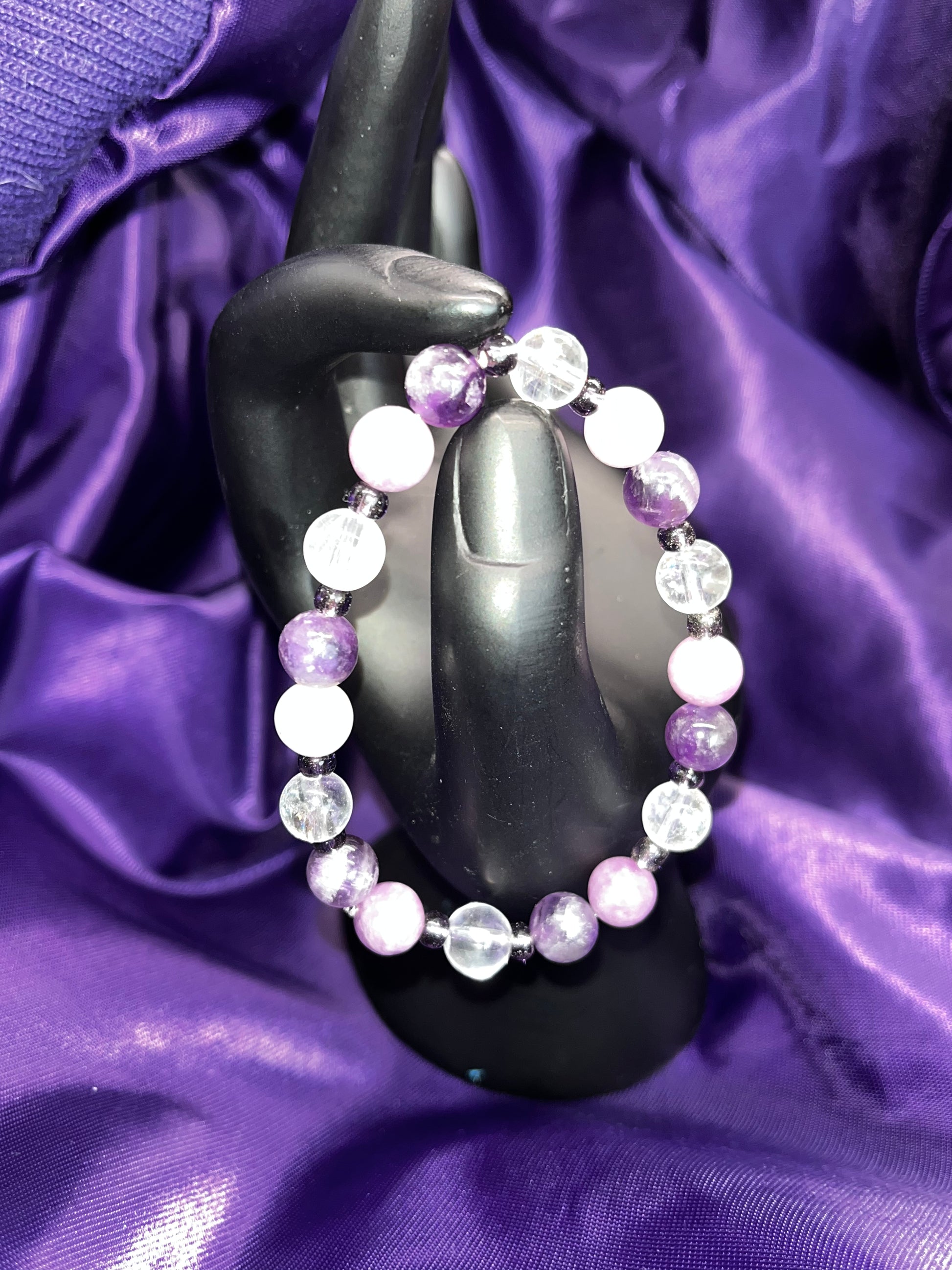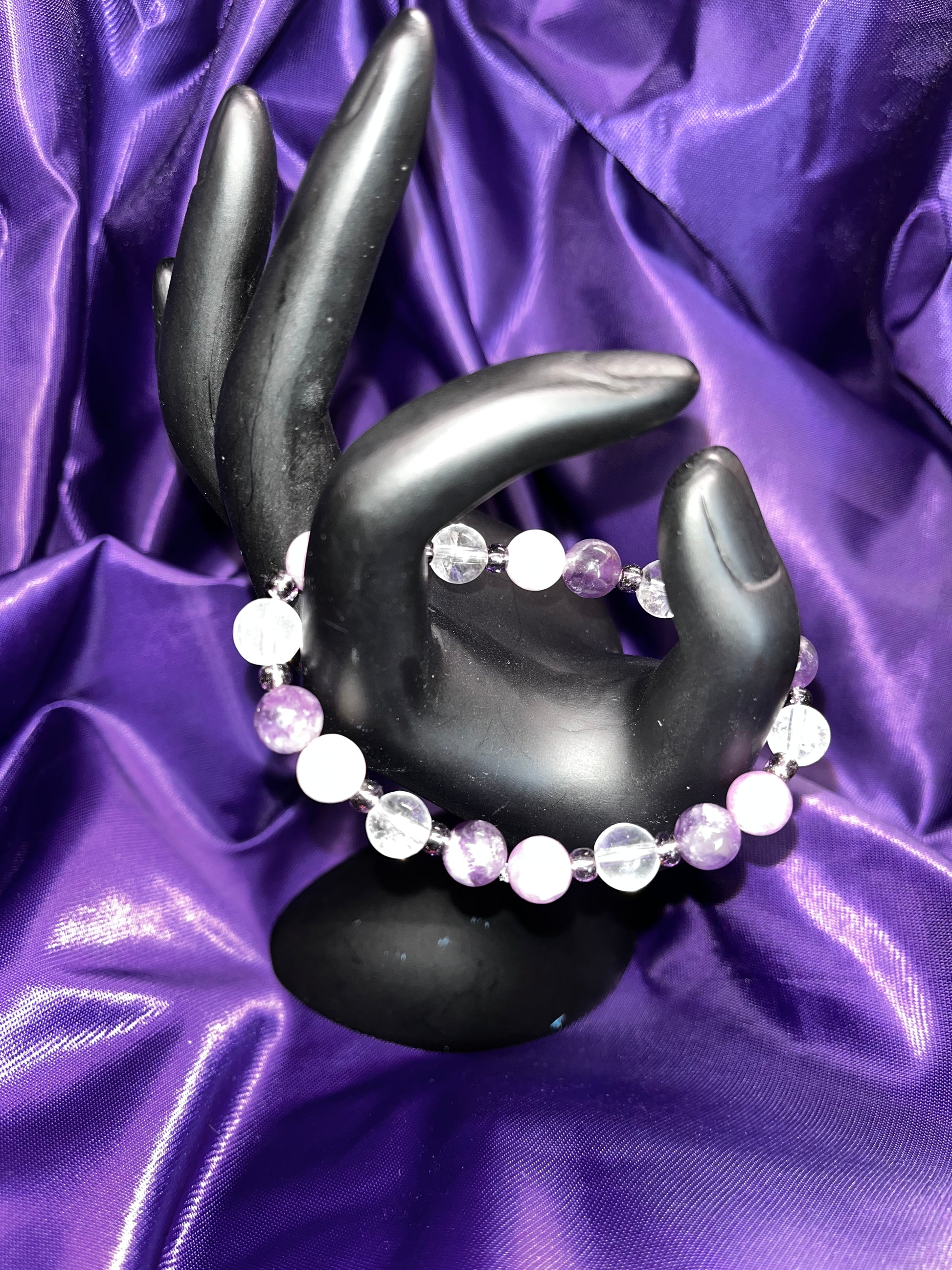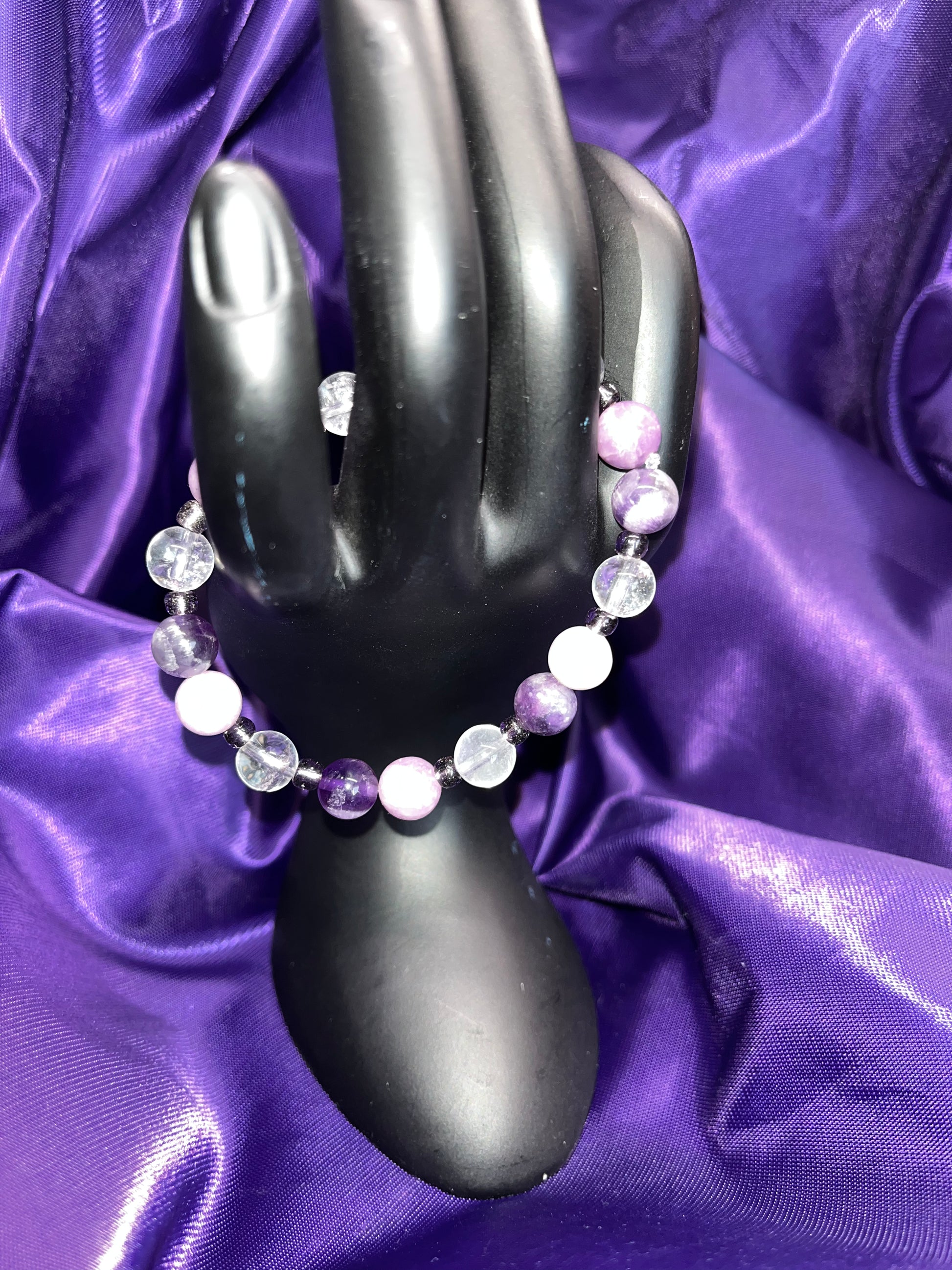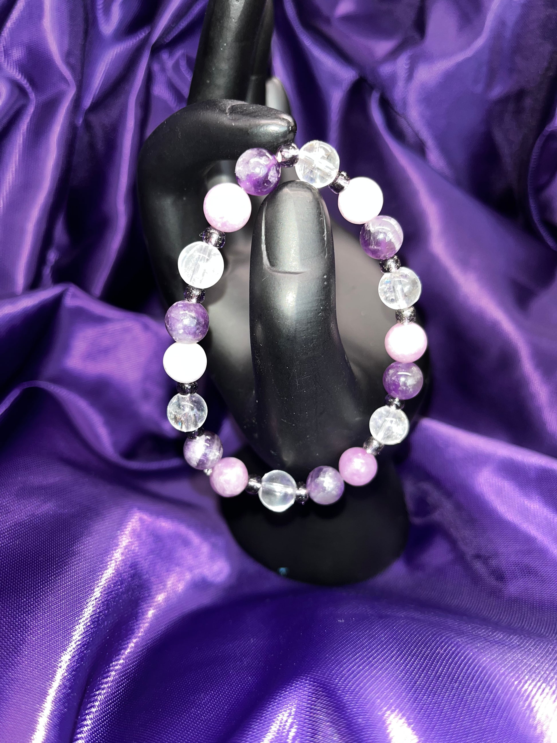 Inspired by Taylor Swift's Album Speak Now. I am a HUGE Speak Now fan!! This bracelet would have helped Taylor during her writing of the album! This bracelet has amethyst and lepidolite, which can both help to overcome emotional dependency and compulsive behaviors! Trash those terrible relationships! I also added clear quartz to magnify and brighten up the bracelet, and finish the design with purple beads.