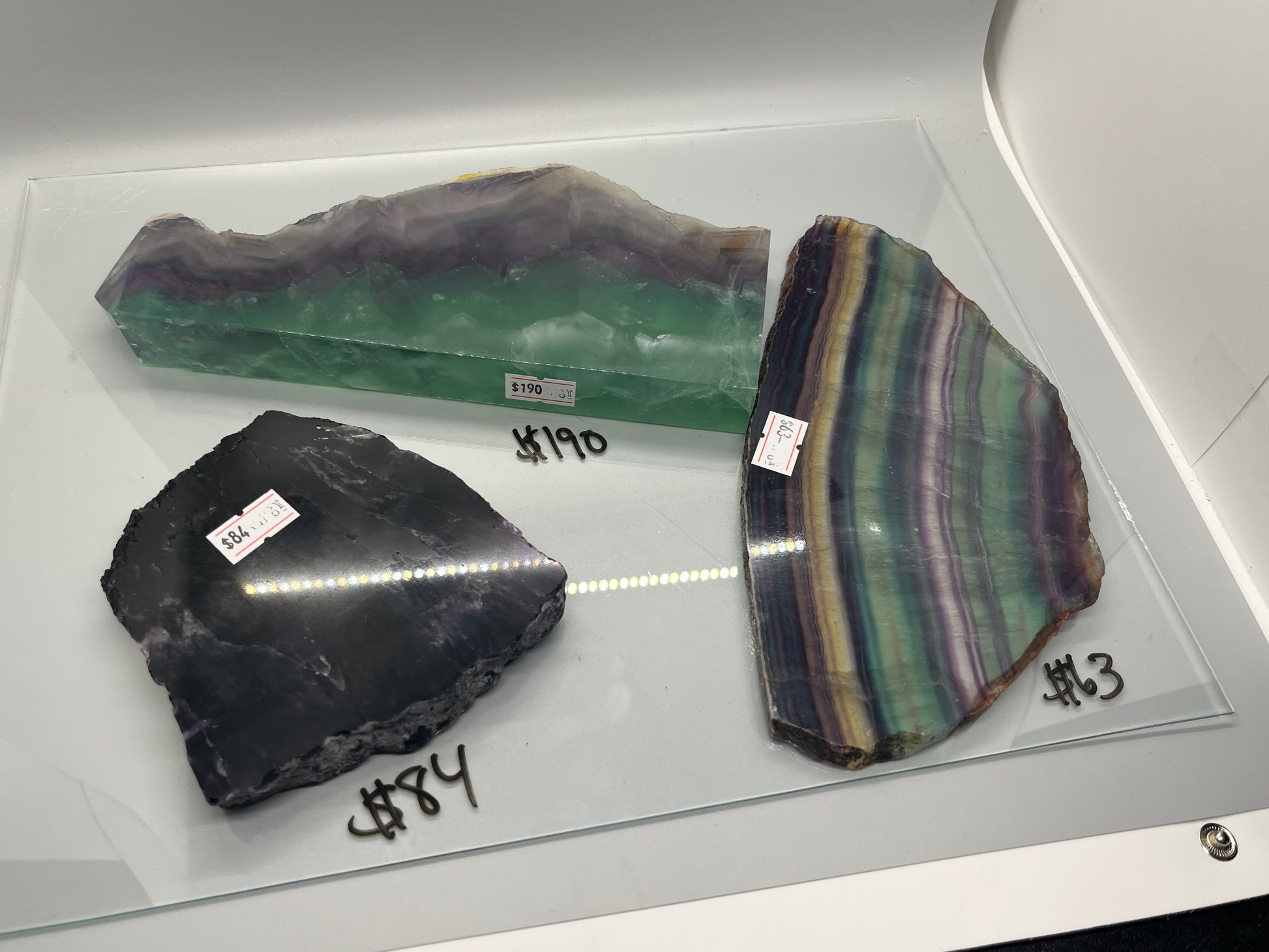 These are two very unique slabs of fluorite. The lighter piece can stand 2 separate ways, weighs over 2 lbs, and has a druzy edge. The darker piece is the absolute darkest piece of fluorite I have ever seen! Light does pass through it, but it is a deep velvety deep violet, with a few traces of green.